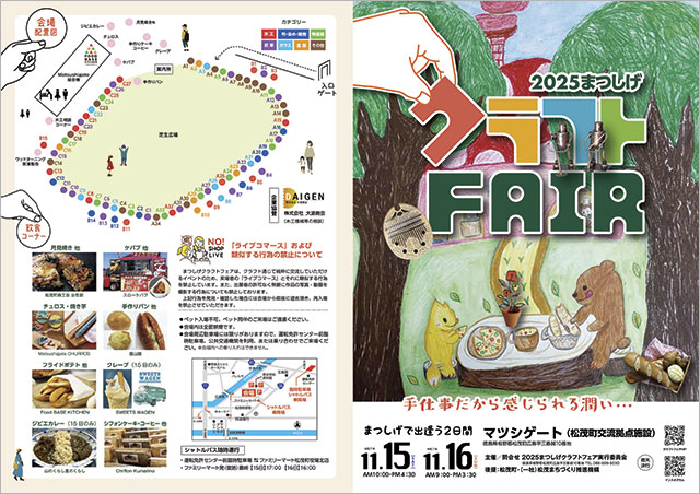 注意事項:まつしげクラフトフェアは、クラフトを通じて純粋に交流していただけるイベントのため、来場者の「ライブコマース」とそれに類似する転売を目的とした行為を禁止しています。